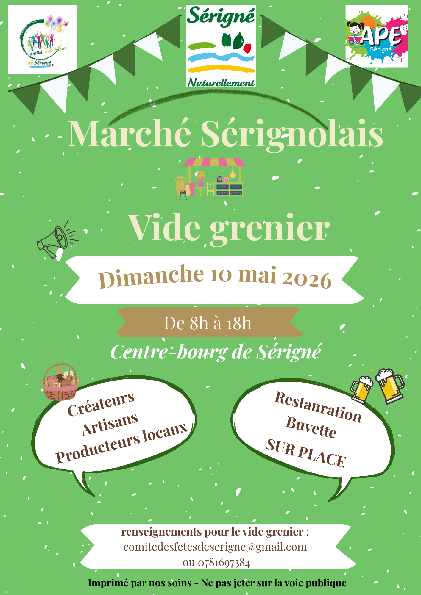 La commission animation organise son traditionnel marché Sérignolais regroupant les artisans, commerçants, créateurs et producteurs locaux le dimanche 10 mai 2026 place du petit logis. Le Comité des fêtes et l’APE organiseront le même jour un vide grenier dans les rues de Sérigné. Lors de cette journée, vous pourrez rencontrer une vingtaine d’exposant pour [...]